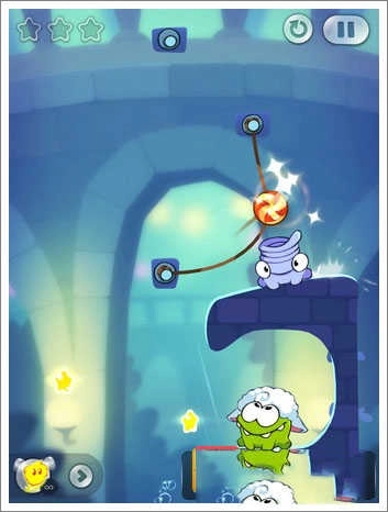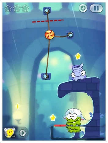 游戏开始时,先把Om Nom正上方的垂直绳索剪断,让糖果自然下落并掠过第一颗星星。这时候要注意,不能让Toss提前把糖果截走,下落的路线得顺畅没有阻碍。