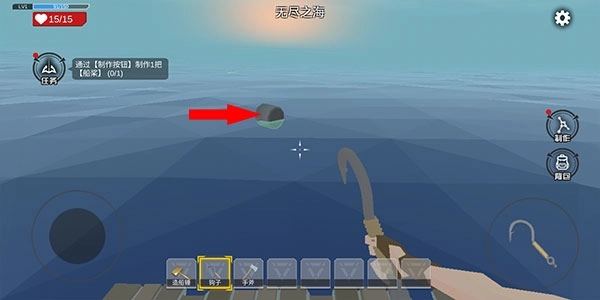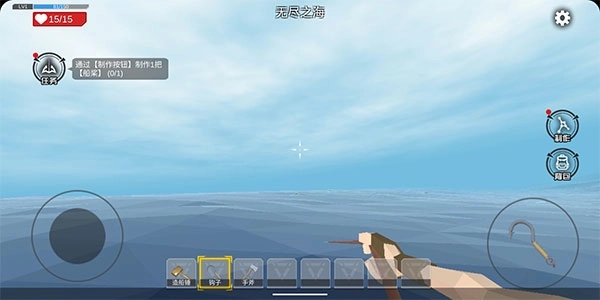 通过左侧的方向盘操控角色移动,右侧的钩子按钮可用于收集海面上的材料