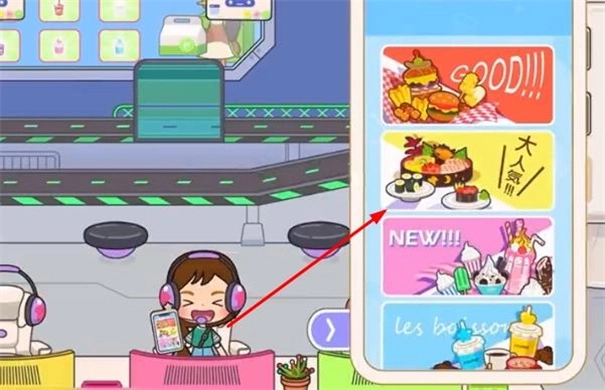 4、挑选其中一类进入,点击心仪的食物即可,随后在上方的传送带处等候外卖送达就行。