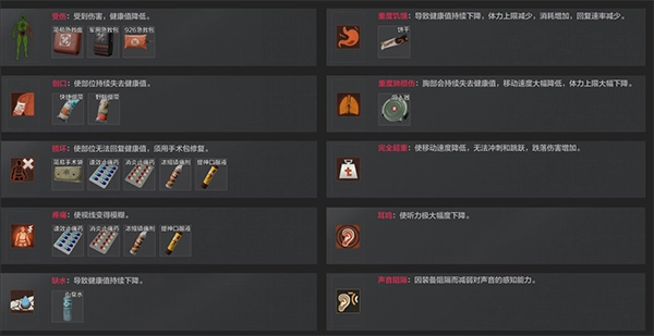 当身体某一部位受伤,健康值会随之降低,该部位会呈现红色。若该部位健康值持续下降至0,就会进入损坏状态,显示为黑色。此时无法通过治疗恢复该部位健康值,视线会因疼痛变得模糊,身体机能也会受影响:“头部”和“胸部”一旦损坏便会撤离失败,因此残血时要尽快治疗。