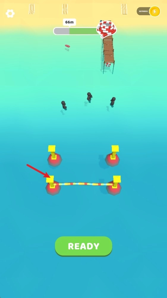 1、在游戏里,我们点击柱子后拖动,就能用绳索把它们连接起来。