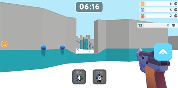 3、左侧滑动能够操控方向,右侧滑动可以调节视角,点击右侧蓝色向上箭头即可实现跳跃;消灭4个敌人可获取雷达,消灭8个敌人能得到炮塔。