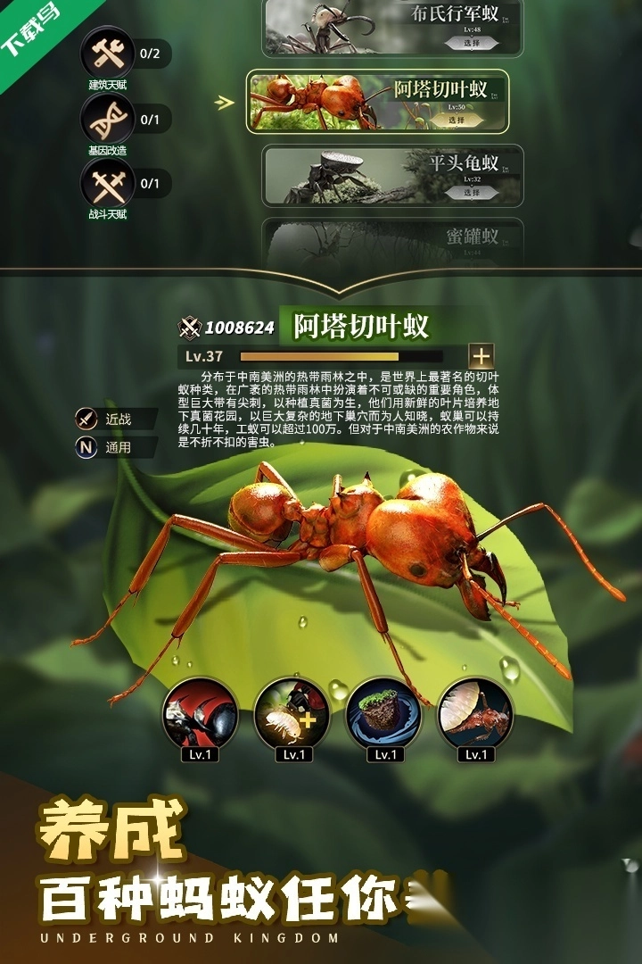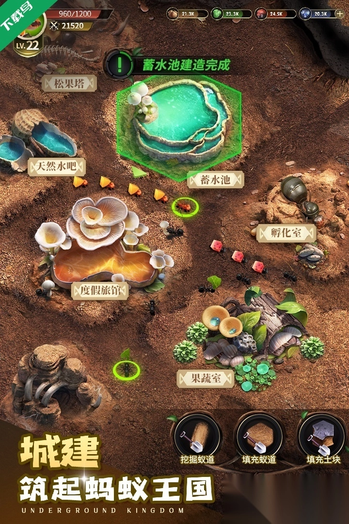 在危机四伏的微观天地中,你将化身新生蚁后,白手起家搭建地下巢穴,培育独有的蚂蚁群落,探索这片辽阔又神秘的土地。这是一场从渺小族群蜕变为庞大地下帝国的完整进化之旅,你可以在这里尽情感受策略经营与生存发展的深层趣味,经典玩法与便捷操作正等你来开启。