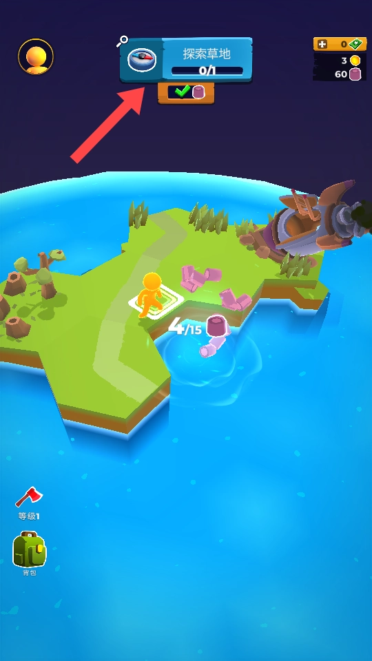 3、完成【砍木头】任务后,留意新发布的【探索草地】任务,操控角色前往草地的指定区域,完成探索任务。