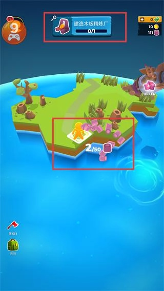 3、在【建造木板精炼厂】的任务区域内,收集所需材料,直至进度推进到【2/50】,以此逐步满足建造该设施的条件。