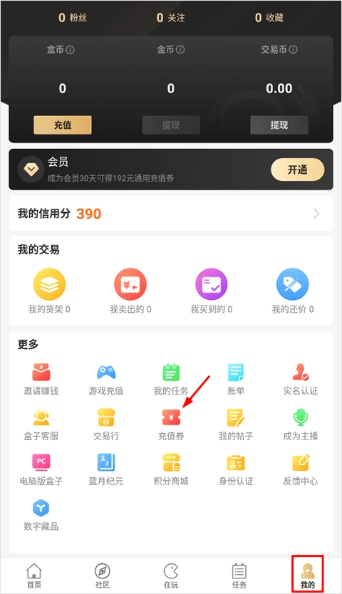 1、打开996传奇盒子安卓版后,在我的功能模块。选择充值券;