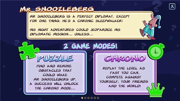 《梦游先生》是一款卡通风格的休闲冒险解谜游戏。游戏主角是一位患有严重梦游症的中年男子,他每次醒来都会发现自己身处陌生的地方。玩家需要在不同场景中解开谜题,帮助这位梦游先生安全回到家中。