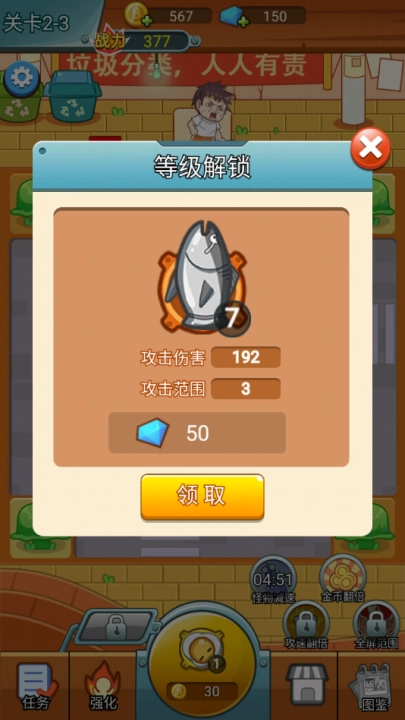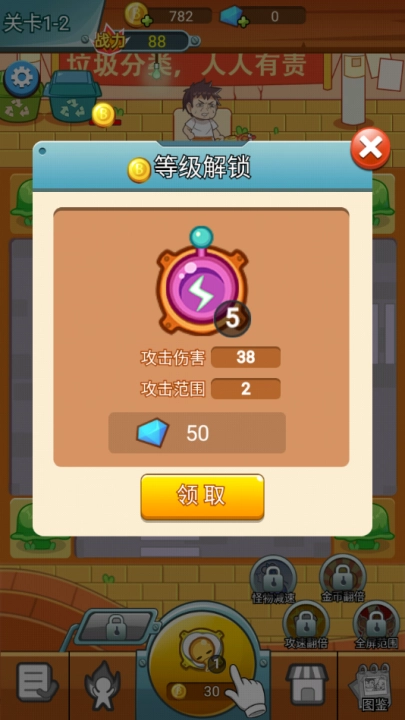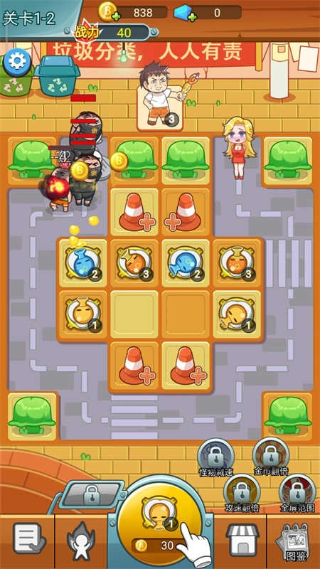 地图上分布着可自由布置的防御位置,从能喷火的泡面桶到可以召唤神兽鸡的收音机,每一种装置都具备独特的攻击逻辑与成长路线。合成系统能让低阶装备重获新生,例如将两个旧式喇叭升级为震耳欲聋的声波放大器,一旦启动就能清空屏幕,不管是敌人还是友方都会受到影响。