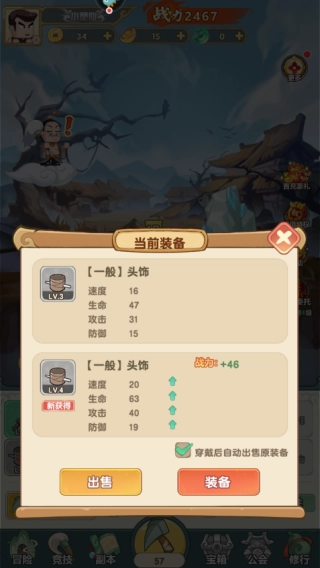 2、把获取到的装备和自己现有的装备做对比,留下属性更高的装备,把属性较低的装备卖掉来换取铜币;