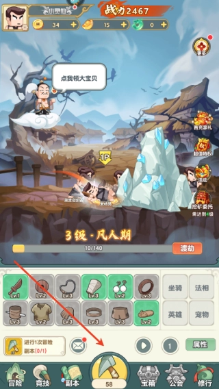1、进入游戏,点击“铁镐”图标敲击矿山获取装备;