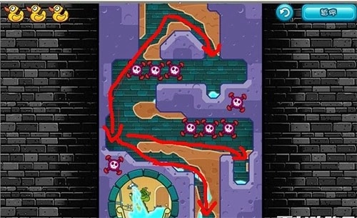 游戏里新增了鸭子,我们不仅要引水,还得把鸭子送到鳄鱼宝宝的浴缸里,好让宝宝高兴。路线我已经截好图了,请看下面。