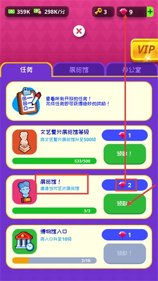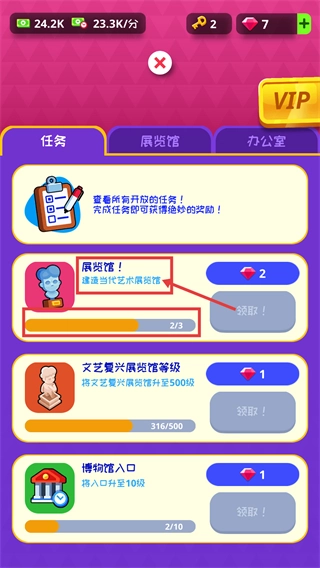 1、在任务界面将【展览馆!-建造当代艺术展览馆】的进度推进到2/3,完成这一进度后就能领取对应的【钻石-2】奖励。