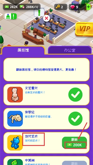 3、在展览馆界面选择【当代艺术】板块,消耗【200K】资源点击【翻新】,即可解锁该展览分类。