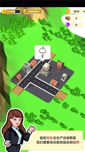 1、城市发展需要某些必需品,这些物品由特定村庄负责生产,之后再运送至城市。第一步要做的是连通城市与村庄之间的道路,具体操作是点击“修路”按钮。