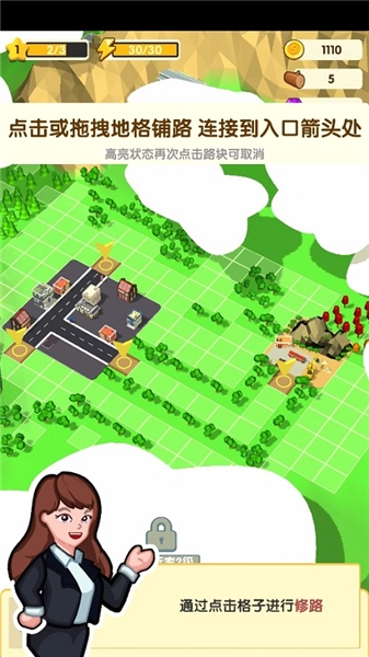 3、修路操作通过点击格子来完成。你可以点击或拖拽地格来铺设道路,当路块处于高亮状态时,再次点击该路块就能取消铺设。