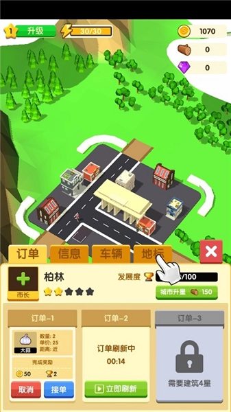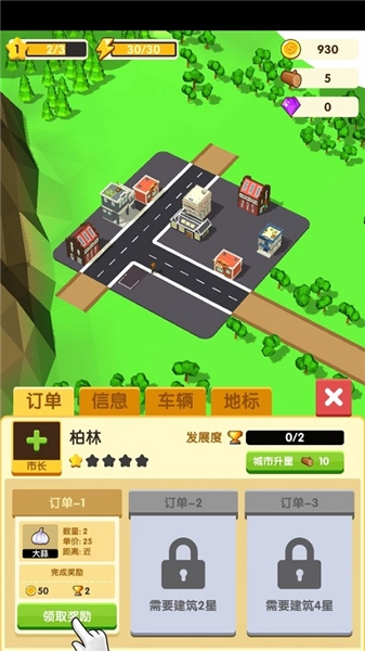 5、订单完成后,可继续在城市区域点击领取奖励!奖励包含金币与城市发展度,金币可用于城市或农村的升级,当城市发展度达到特定条件时,能够为城市升星。
