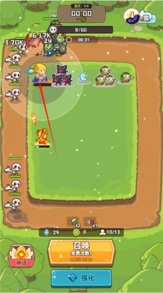 1、利用道具,让战场上的敌人行动速度变慢,我方防御塔趁机疯狂输出。
