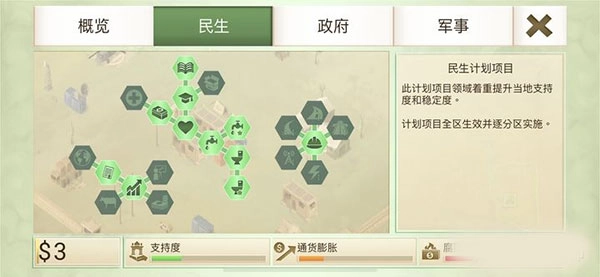 进入叛乱公司中文版最新版本的游戏后,你的军队得驻扎在当地并持续增强实力。游戏的操作菜单包含概览、平民、政府与军队这四个选项,你需要获取资金来维持政府的正常运转,还得修建水电、医疗、交通、通讯等基础设施,以此提升经济发展水平和当地民众的支持率,同时要防范腐败问题,避免内部出现祸乱。