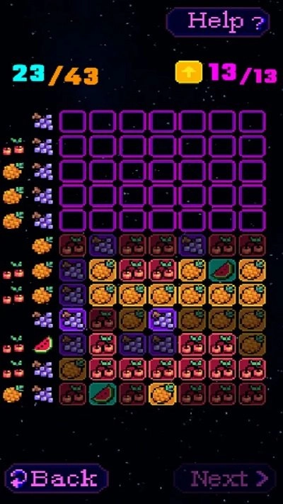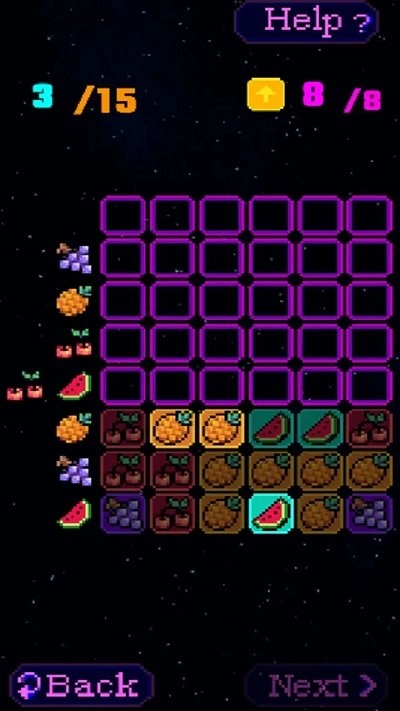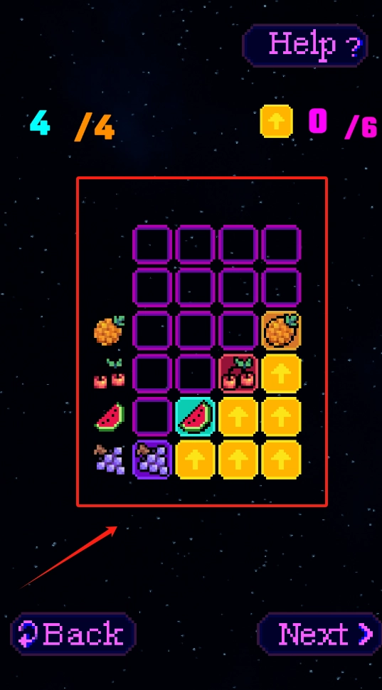 3、点击黄色箭头按钮操作水果,按Next进入下一关,Back可退回上一步调整。