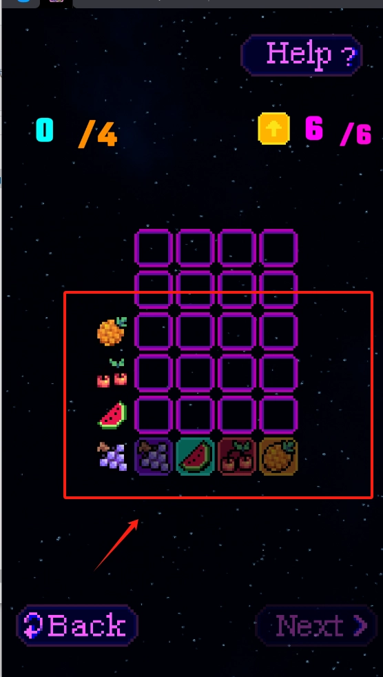 2、按Next翻页,选水果拖进紫色方格,完成后点Back返回或继续下一步。