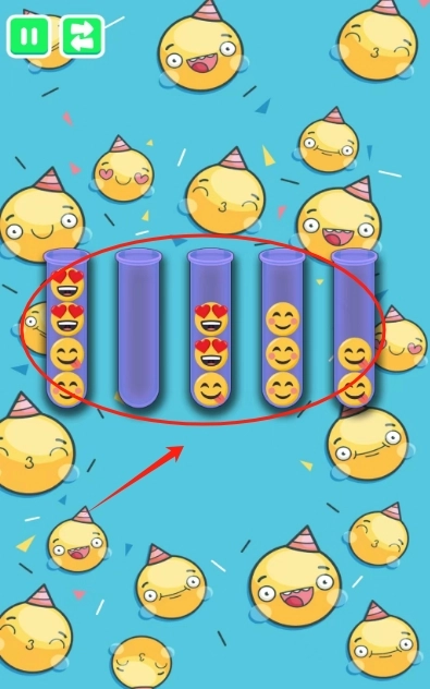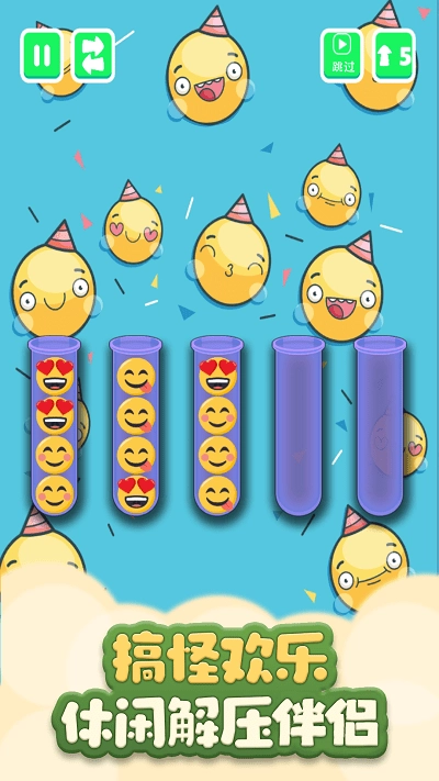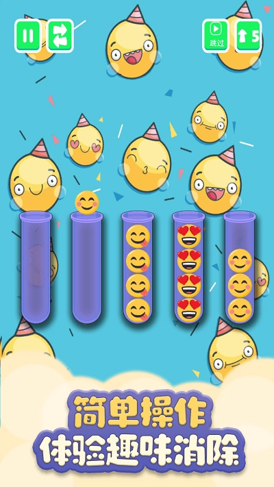 1、创新表情消除机制,玩家需将相同表情图标拖拽至同一试管,满3个即可消除。