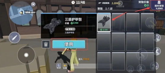 点击右上角的揽件背包,点击使用穿上护甲包。