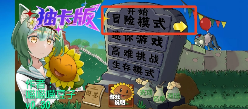1、这款植物大战僵尸抽卡重制版游戏中,新植物需要通过关卡抽卡获得,首先我们点击墓碑第一个【冒险模式】。