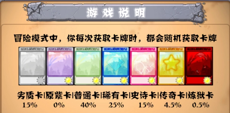5、卡牌获取概率,如下图所示,只有在冒险模式才能获得卡牌哦。