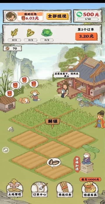 3、特色订单系统要求玩家依据居民的需求来精准搭配农作物,完成订单后能够获得金币和红包的双重奖励,随着订单量的累积,提现收益比例也会相应提升。