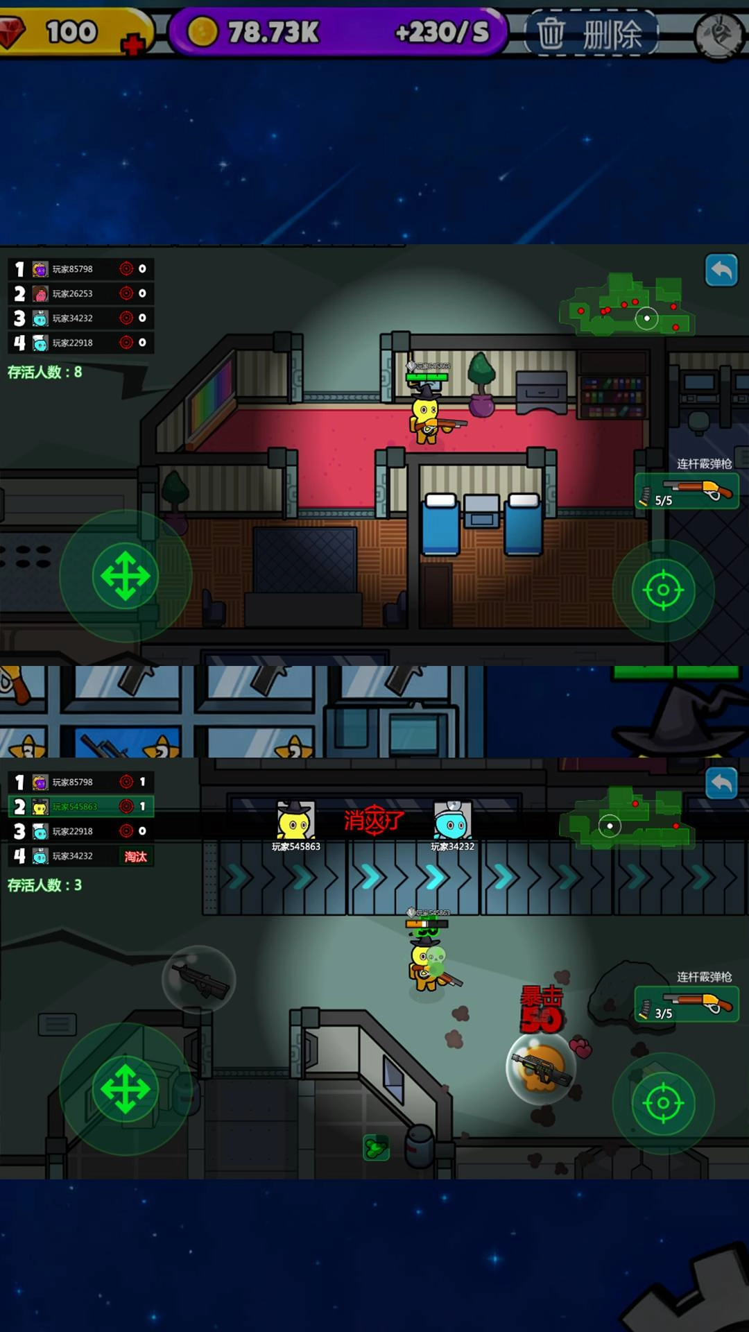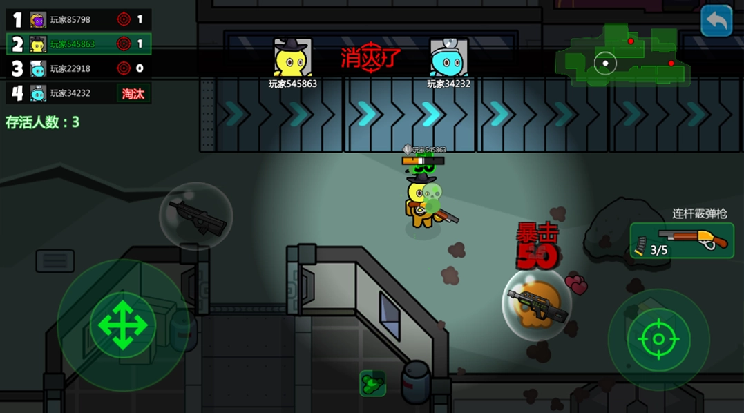1、点击“开始战斗”进入对战场景,操控角色在战场中移动,使用武器攻击其他玩家,凭借灵活操作淘汰对手,提升存活排名。