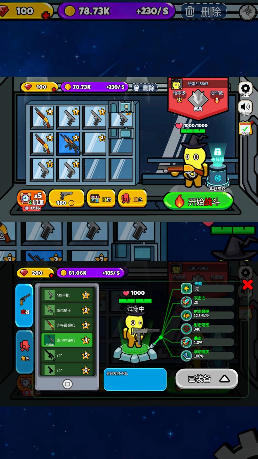 2、把背包里相同的武器合成升级,解锁属性更强大的新武器,并且根据战斗的需要,强化角色的移动速度、射击范围等属性。