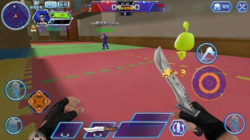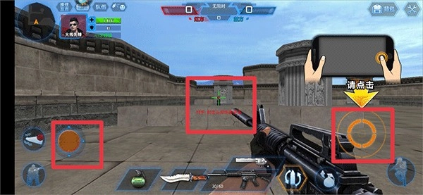 2、在游戏中当敌人出现时,按住左边按钮来移动角色,右边射击按钮来滑动视角,将枪准心瞄准敌人后会自动射击并将敌人击杀