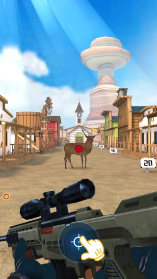 3.点击狙击枪就能开启狙击模式,接下来你得把准星对准目标立牌的弱点区域,再次点击屏幕就能发射子弹攻击目标。